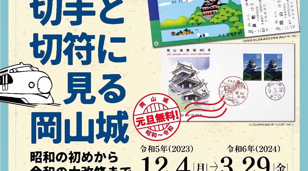 昭和の再建、平成の改修、そして令和の大改修。再建から約60年の月日を重ねてきた岡山城。皆さんの記憶に残る岡山城の思い出はありますか? 本展では昭和の初めから、昨年の令和にかけて発行された岡山城ゆかりの切符や切手などにスポットをあて、岡山城の歴史を紹介します。切符や切手ならではの、ユニークなデザインや表現、魅力あふれる岡山城の姿をお楽しみください。