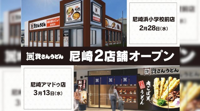 2024年2月28日(水)に「資さんうどん」67店舗目となる「尼崎浜小学校前店」、3月13日(水)に68店舗目となる「尼崎アマドゥ店」を、2店舗連続オープンすることが決定いたしました。