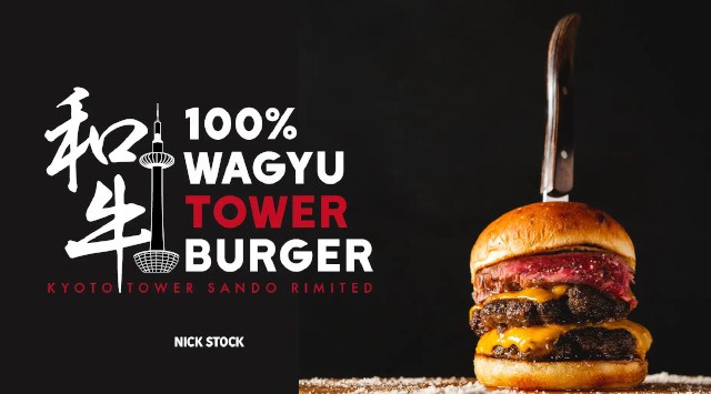 和牛パティと和牛ステーキを京都タワーのように高く積み上げたスペシャルな限定メニュー「100% WAGYU TOWER BURGER(100%和牛TOWERバーガー)」が新登場!